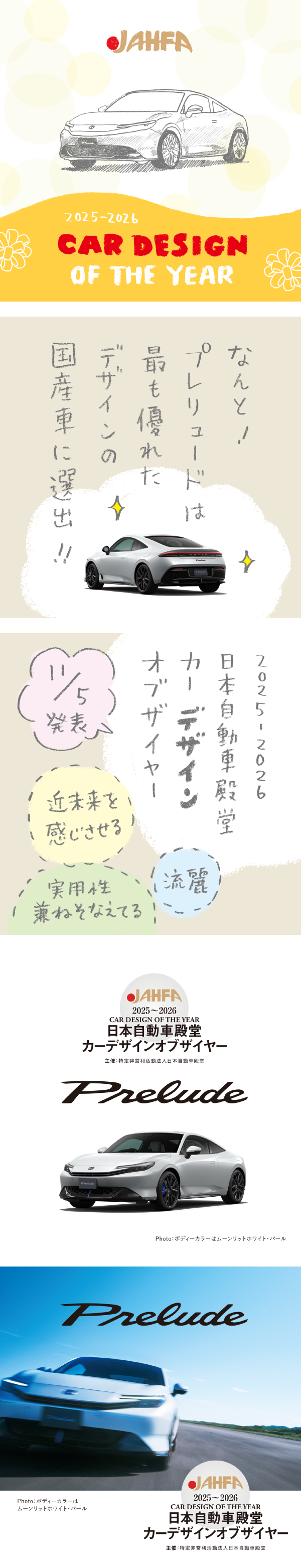 今回、2025~2026の「日本自動車殿堂カーオブザイヤー」に N-ONE e: とその開発チームが輝きましたが、なんとプレリュードとそのデザイングループも「日本自動車殿堂カーデザインオブザイヤー」を受賞しました! パチパチ!