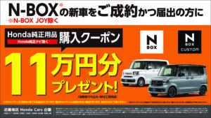 N-BOX(N-BOX JOY除く)の新車をご成約かつ届出の方に、Honda純正用品購入クーポン11万円分プレゼント!