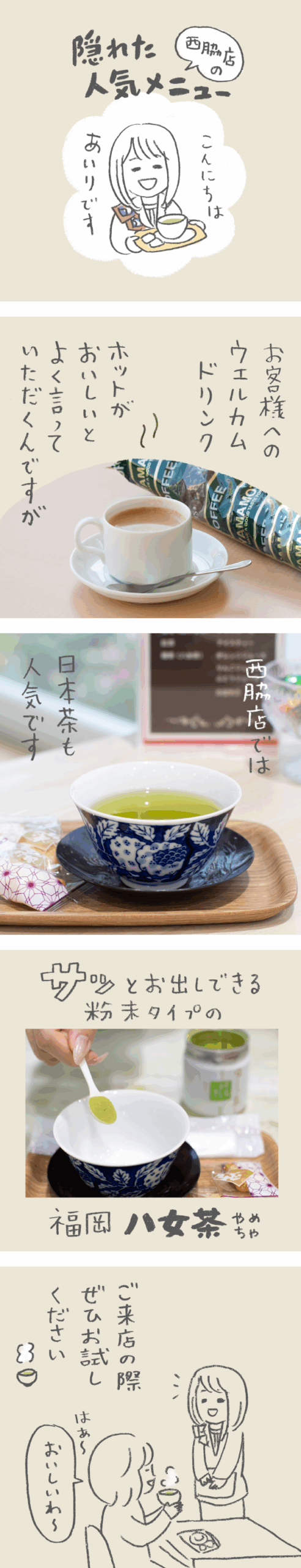 お客様にはよくコーヒーがおいしいと言っていただくのですが、西脇店では「日本茶」も評判なんです。